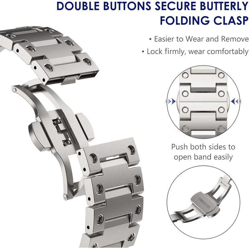 بند استیل ضد حش و ضد حساسیت،..، دارای مکانیزم قفل پروانه ای،..، تنظیم طول بند با جداسازی آسان بند ها از طریق پین،..، مناسب برای استفاده با استایل رسمی برای آقایان و خانم ها